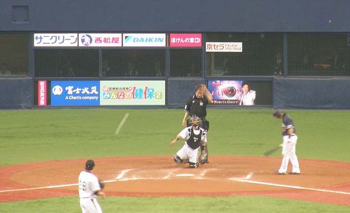 試合中、バックネット裏のLED看板に、DAIKINロゴや商品名が表示されます。