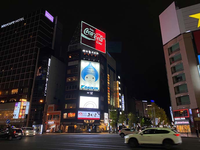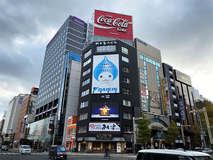 北海道随一の繁華街、すすきのにある「わたなべビル」の壁面に、ぴちょんくんの大型看板を掲出しています。