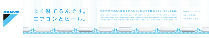 あまり知られていませんが、エアコンの売れ行きは天候によって劇的に変化しま す。まるで、ビールのように。市場の動きにタイムリーに連動し、天気予測も織 り込みながら、600以上ある機種の中から必要な物を必要なだけつくり届ける。 そんな複雑なことをやってのける製造ラインを、今までのノウハウを結集しつく りました。研究、開発、生産技術、全てがオリジナルでなければオンリーワンは つくれない。ダイキンはそう考えます。