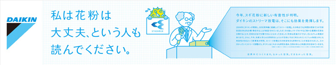 2004年にダイキンが開発し、空気清浄機に搭載した「ストリーマ放電」。その時点でも2時間の照射でスギ花粉抗原を99.6%分解・除去することが実証※されていましたが、その後ヒノキ・ブタクサなど様々な種類の花粉を分解することや、花粉を芯まで分解できることも分ってきました(花粉は表面だけでなく、芯にもアレル物質があります)。さらに、今年、京都大学との共同研究によりスギ花粉に今まで考えられていたアレル物質以外にも有害性があるという新事実が判明。ストリーマ放電はその有害性をも抑制することが実証されました。次々分かっていくストリーマ放電の力。ダイキンはこれからも研究を進め、空気の安心と快適を突き詰めていきます。