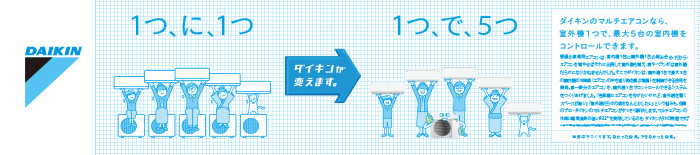 そこでダイキンは、室外機1台で最大5台の室内機の冷媒量(エアコンの中を巡り熱を運ぶ物質)を制御できる技術を開発。家一軒分のエアコンを、室外機1台でコントロールできるシステムをつくりあげました。