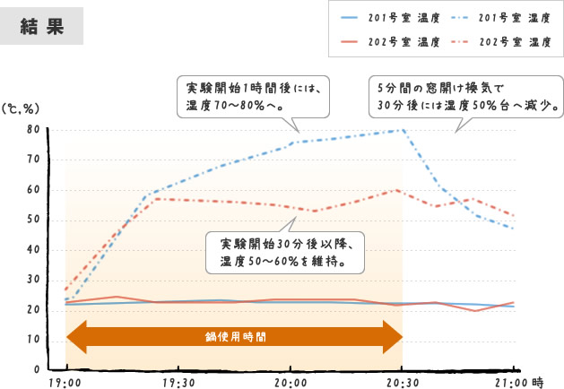 徹底検証1と同じ「湿度コントロールをする部屋」と「湿度コントロールをしない部屋」の中央にそれぞれ鍋を設置し、90分間エアコンを稼動させながら鍋を加熱。その時の温度と湿度の変化を計測し、その後、窓ガラスに結露がどの程度発生するかを検証した。