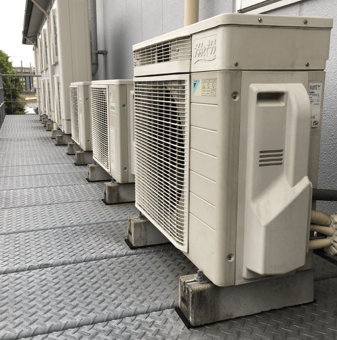 多くの場合、樹脂性の軽い置き台が使われますが、強風が吹く場所に室外機を設置する場合は、コンクリート製の重い置き台を採用することをお勧めします。また、コンクリート製の置き台の下に ゴムでできた防振パッドを敷くと、強風によるズレの防止にもなりますので効果的です。