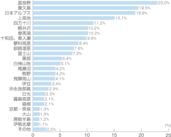 「屋久島」(20.5%)、以下「日本アルプス」(19.5%)「上高地」(18.9%)「四万十川」(15.1%)・・・ 全体をみる