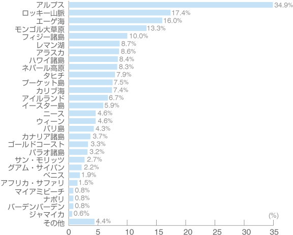 「アルプス」をあげました。次いで「ロッキー山脈」(17.4%)「エーゲ海」(16.0%)、以下・・・