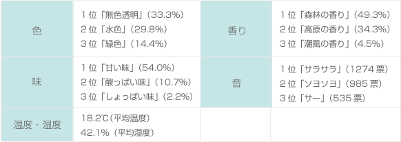 「無色透明か水色」で、「森林の香り」がして、「甘い味」の、「サラサラ、ソヨソヨ」という音がする「温度18.2℃・湿度42.1%」の空気。