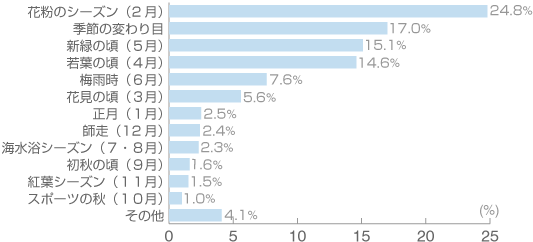 季節の中では、花粉症で困っている人の多い「花粉のシーズン」がトップにあげられました。次いで「新緑の頃(5