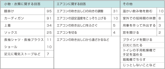 「効きすぎ(冷えすぎ)」と回答した方に、自分だけが行っているささやかな"冷えすぎ対策"を聞きたところ、下記のような内容があげられました。