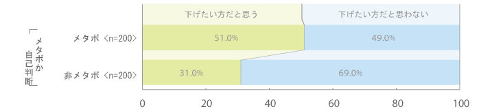 メタボな人は「下げたい方だと思う」(51.0%)が半数以上を占めており、メタボでない人(31.0%)を大きく上回っています。