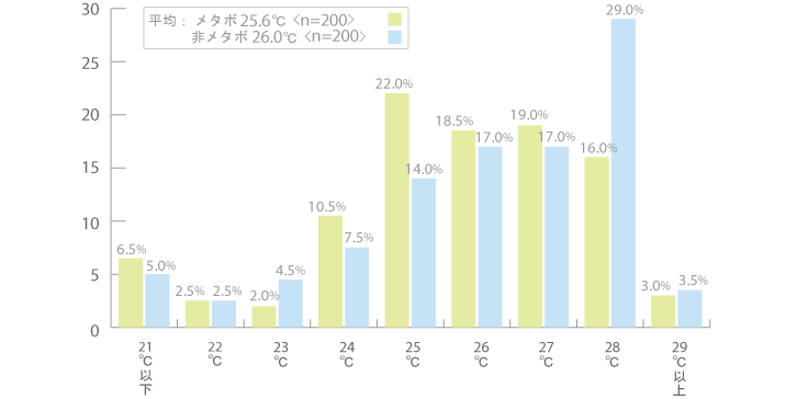 <メタボな人><メタボでない人>ともに最も多いのは「30℃」ですが、その割合は<メタボでない人>(41.0%)が<メタ