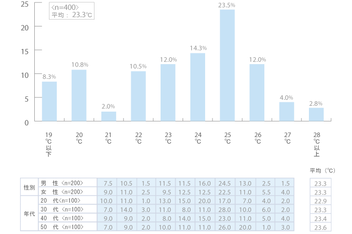 最も多いのは「25℃」(23.5%)で2割強があげています。以下、「24℃」(14.3%)、「23℃」「26℃」(各12.0%)などが1割強の割合で続いています。平均は23.3℃です。