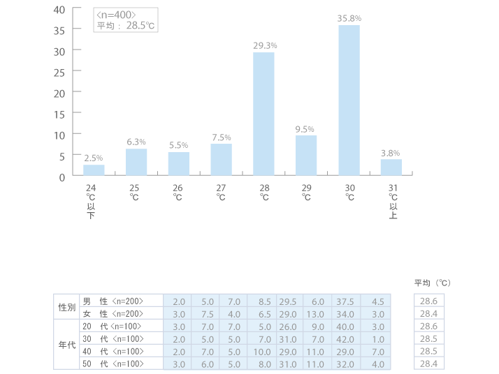 最も多いのは「30℃」(35.8%)で、次いで「28℃」(29.3%)の順となっています。