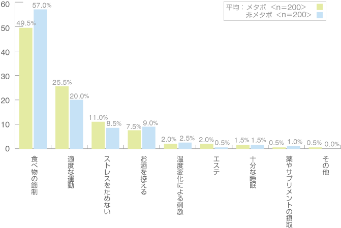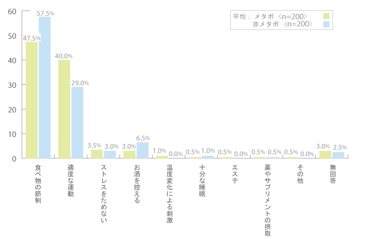 メタボでない人では「食べ物の節制」(57.5%)が際立っていますが、メタボな人では「適度な運動」(40.0%)も4割と比較的多く、トップの「食べ物の節制」(47.5%)とあまり差がありません。
