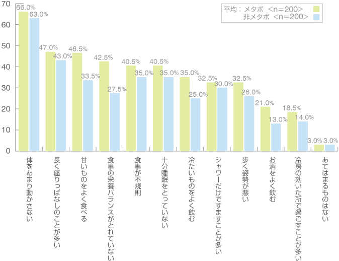 「食事の栄養バランスがとれていない」「甘いものをよく食べる」「冷たいものをよく飲む」を始め、全ての行為で<メタボな人>が<メタボでない人>を上回っています。