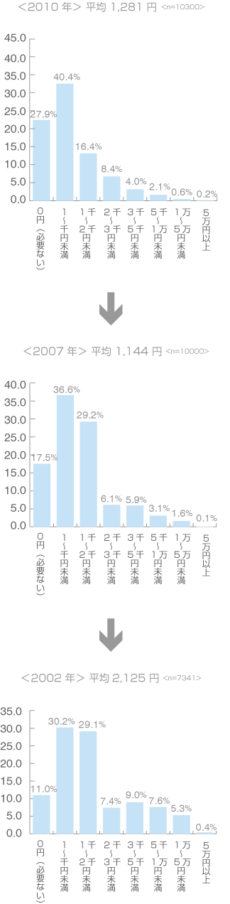 「1~1000円未満」(40.4%)が最も多く、次いで「0円(必要ない)」(27.9%)となっています。上記の通りコスト意識は感じ