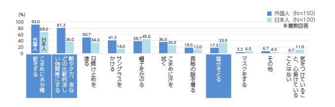 「水分補給」、「涼しい時間帯にする」が多数。「塩分をとる」は湿気が高い日本ならではの対策。