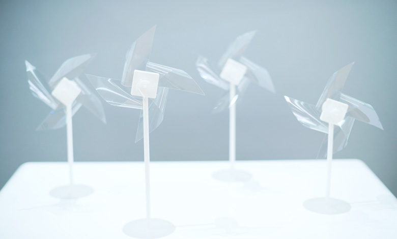 このプロトタイプは、言ってみれば風や息の強さに合わせて奏でる「空気の楽器」です。空気のように透明なシートだからこそ、まわりの空間を損なうことなく不思議な音世界をつくりだすことができます。高機能材料技術が見えない空気の存在価値を表現する——ダイキン・デザインとして伝えたかったメッセージが、この風鈴と風車に込められているのです。
