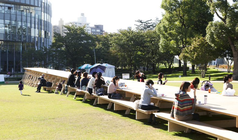 面白いことに、手前のほうではテーブルの下で子どもたちがジャングルジムのようにして遊んでいたり、打ち合わせをしている人がいたり。だんだん先端のほうにいくと、ランチを食べていたり、テーブルの上に座ってのんびりしていたり。同じ場所で、同じ空間で、同じ1枚のテーブルを共有しながら、いろいろな関係やアクティビティが生まれている。とてもよい空気と時間が流れていましたね。