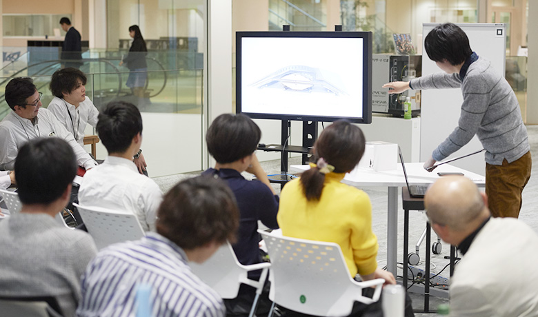コラボレーションの最終日である11 月16 日には、TIC において、学生が1人ずつモックとスライド資料を使いながら、デザインチームを前にプレゼンテーションを行った。2025年の社会ではどのような変化が起きているかを想定し、住宅、介護施設、オフィス、公共空間など、さまざまな場所やシチュエーションにおける空調機器のアイデアを解説していく。
