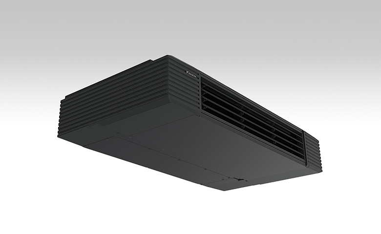 スタイリッシュフローの特徴として「空間に収まることで完成する」という事が挙げられます。つまり従来型の様に製品単体で完成するデザインではなく、主役である空間と調和しながら、さりげなく寄り添う事を前提としたデザインという事です。例えば、広く見えるスケルトン天井において極力存在感を感じさせないように、製品の高さを210mmという薄さに仕上げました。また、カラ―とフォルムも従来的な外観イメージを払拭しました。直線基調のスクエアフォルムの外観デザインに加えマットな質感のブラックカラ―に仕上げました。空間への親和性の高いデザインと、様々な天井空間に調和しやすいカラ―にする事で、多様化している内装設計者のこだわりに応えられるようにしています。