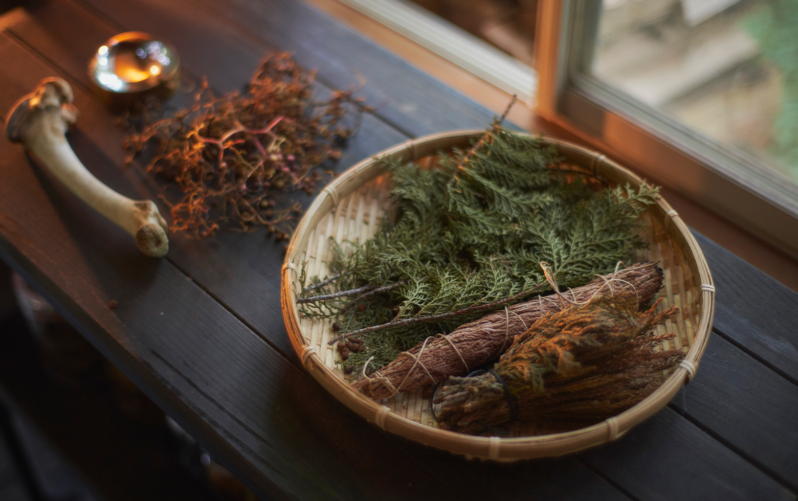 植物にはフィトンチッド(phytoncide)という化学成分が含まれているそうなんですね。植物が刺激を受けた時に、自分自身を守るために発する殺菌成分のある揮発性物質です。森に入ると「森のいい匂い」と感じることがありますが、それがフィトンチッドの匂いなのです。人間にとってもリラックス効果があり、免疫機能を高めたり、殺菌効果があることも証明されているそうです。そのことを思い出し、フィトンチッドがたっぷり含まれた枝葉を束ねたタリスマンを、東京でステイホーム中の友人たちに贈ることにしたのです。ちょうど4月から5月頃、コロナ禍が深刻化して、消毒用のアルコールやマスクが手に入りづらかった時期でした。都市で移動や外出を制限されてストレスが溜まる生活の中に、少しでも森の気を届けることができたらと思ったのです。