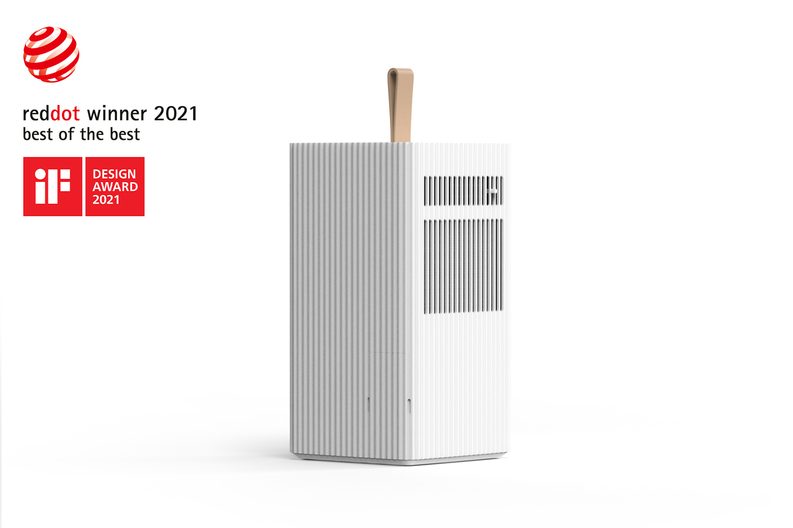 This highly functional portable air conditioner showcases an impressively minimalist design. It features an iconic language of form that aestheticises its surroundings. The high-quality leather handle on the top integrates as a visually surprising design element and allows this unit to be easily carried around for placement in any room. High comfort in use is offered by its discreetly integrated and easy-to-operate control elements.