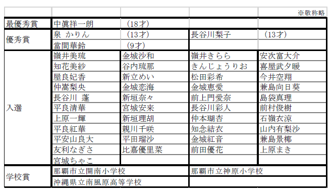 中眞さんの作品をベースに作成した大会ポスターは、2017年1月より沖縄県下を始め、全国の関係先に掲出されます。最優秀賞と優秀賞の4作品については、沖縄県庁1F県民ホールにおいて2017年1月30日(月)から2月3日(金)の間、大会ポスターと共に展示・一般公開いたします。