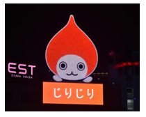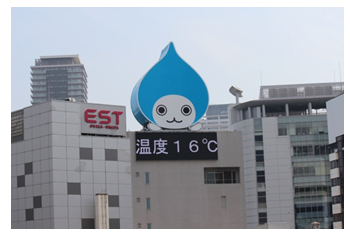 当社は、全国で大型の屋外看板を展開しており、各地の温度を表示してきました。その一つである大阪市北区のシロクチビル屋上の大型ネオン看板を、2016年3月に、当社のキャラクターである“ぴちょんくん”を使ったフルカラーLEDの大型看板にリニューアルしました。この看板には従来の温度表示に加え、湿度も表示しています。