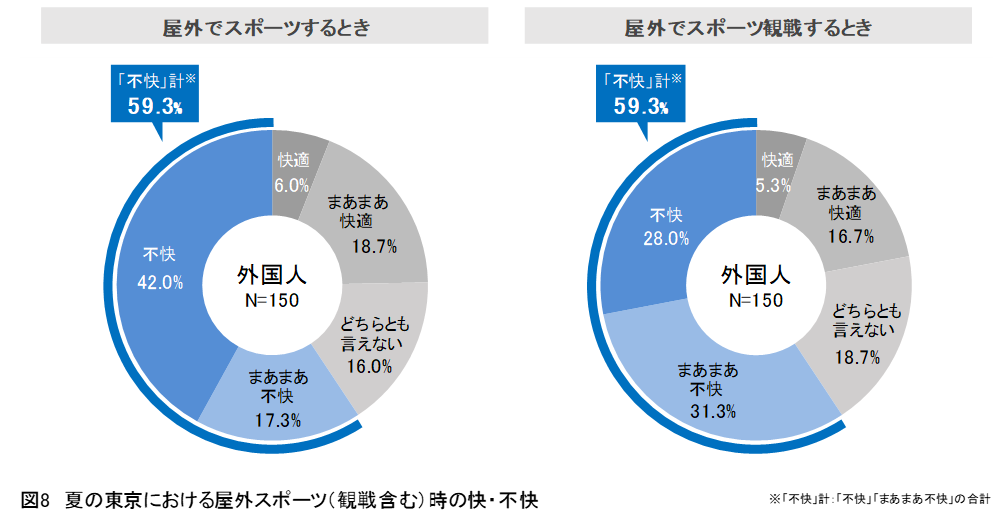 屋外でスポーツをするとき、屋外でスポーツ観戦をするときのどちらも、外国人の約6割(59.3%)が「不快」(「不快」または「まあまあ不快」)と回答しました(図8)。東京の夏の空気環境はスポーツには不向きと考えている人が多いようです。