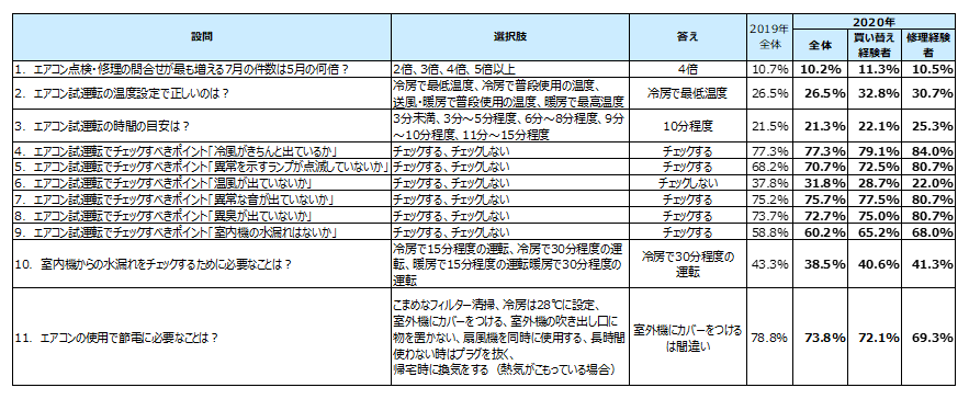 今年も夏を快適に過ごすための正しいエアコンの試運転方法を問う、「エアコンスイッチオンテスト」を実施。全体の正解率は平均51%となりました。5年以内にエアコンを買い替えた方、修理をした方は、比較的正解率が高い結果となっています。
