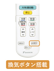 ボタンを押すだけで冷暖房+換気運転ができる「換気ボタン」をリモコンに搭載しました。ライフスタイルや空間形状に合わせ、空間と調和するルームエアコンでも、換気しながら加湿、暖房することで換気と快適を両立が可能です。