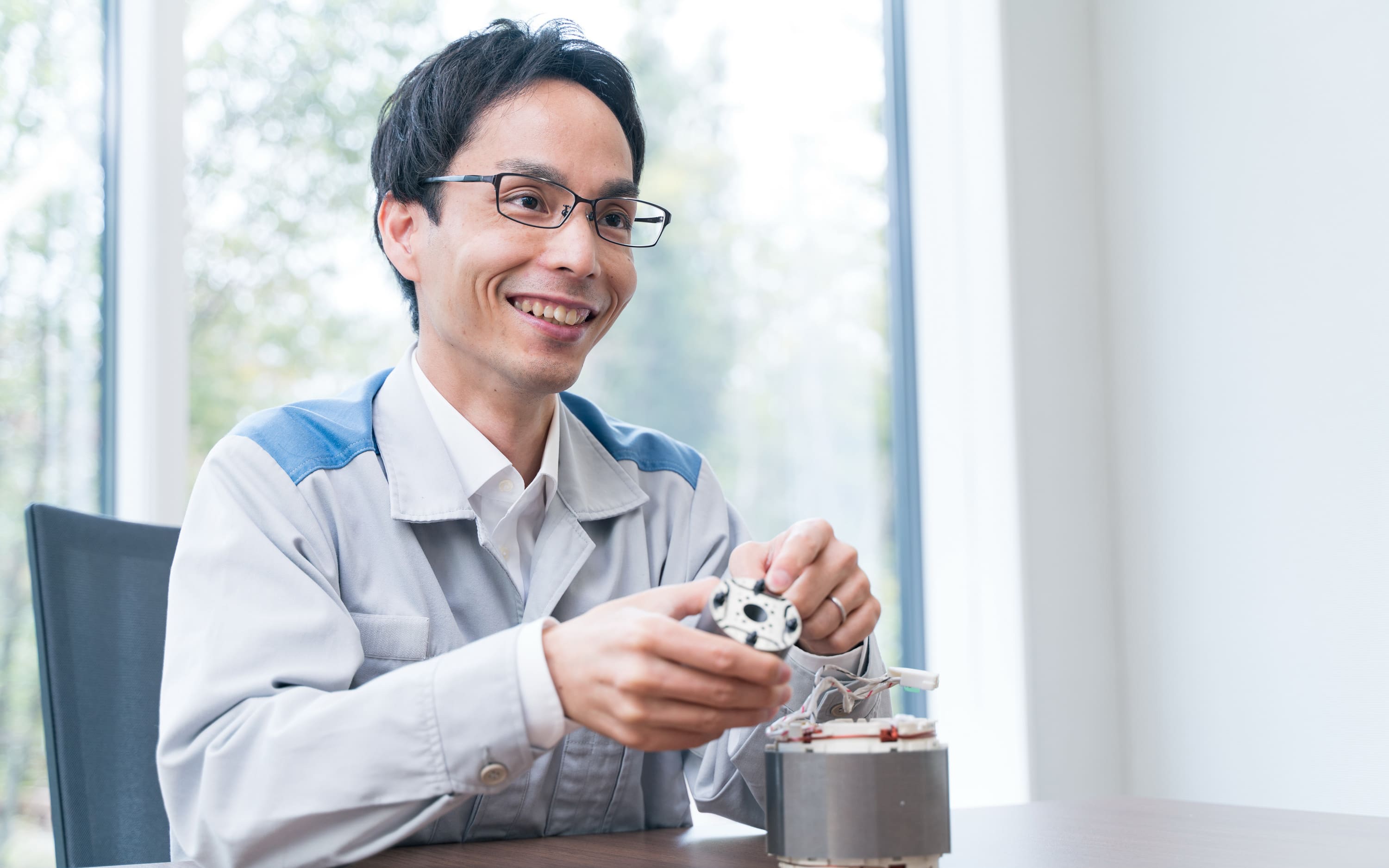 2012年入社。奈良県出身。モータ技術開発を担当。社内だけでなく社外の企業・大学とも協創することで、世界No.1の低振動で高効率なモータを開発することを目指している。
